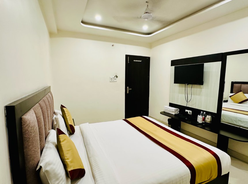 Hotel MK Grand – Varanasi is situated just 750 M from the Shri Kashi Vishwanath Temple. Guests can enjoy complimentary Wi-Fi and free private parking on-site. Each room is thoughtfully designed, featuring a flat-screen TV with cable channels, air conditioning for your comfort, and a cozy seating area. The hotel also offers a 24-hour front desk.